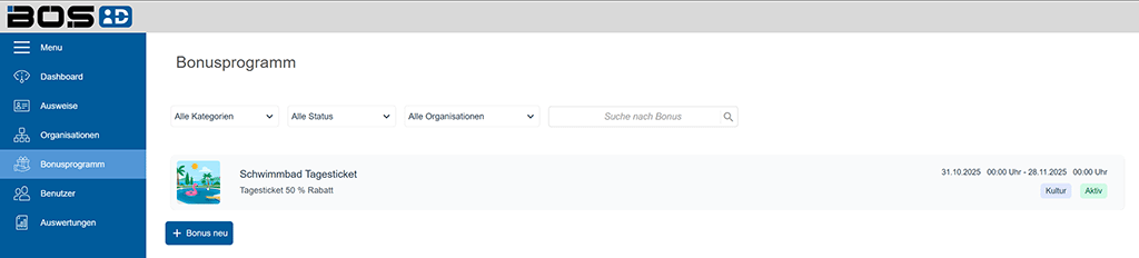Die Funktion „Bonusprogramm“ ist ab 11/2025 im BOS-ID-Portal verfügbar und kann von jedem Benutzer mit Administrator-Rechten genutzt werden.